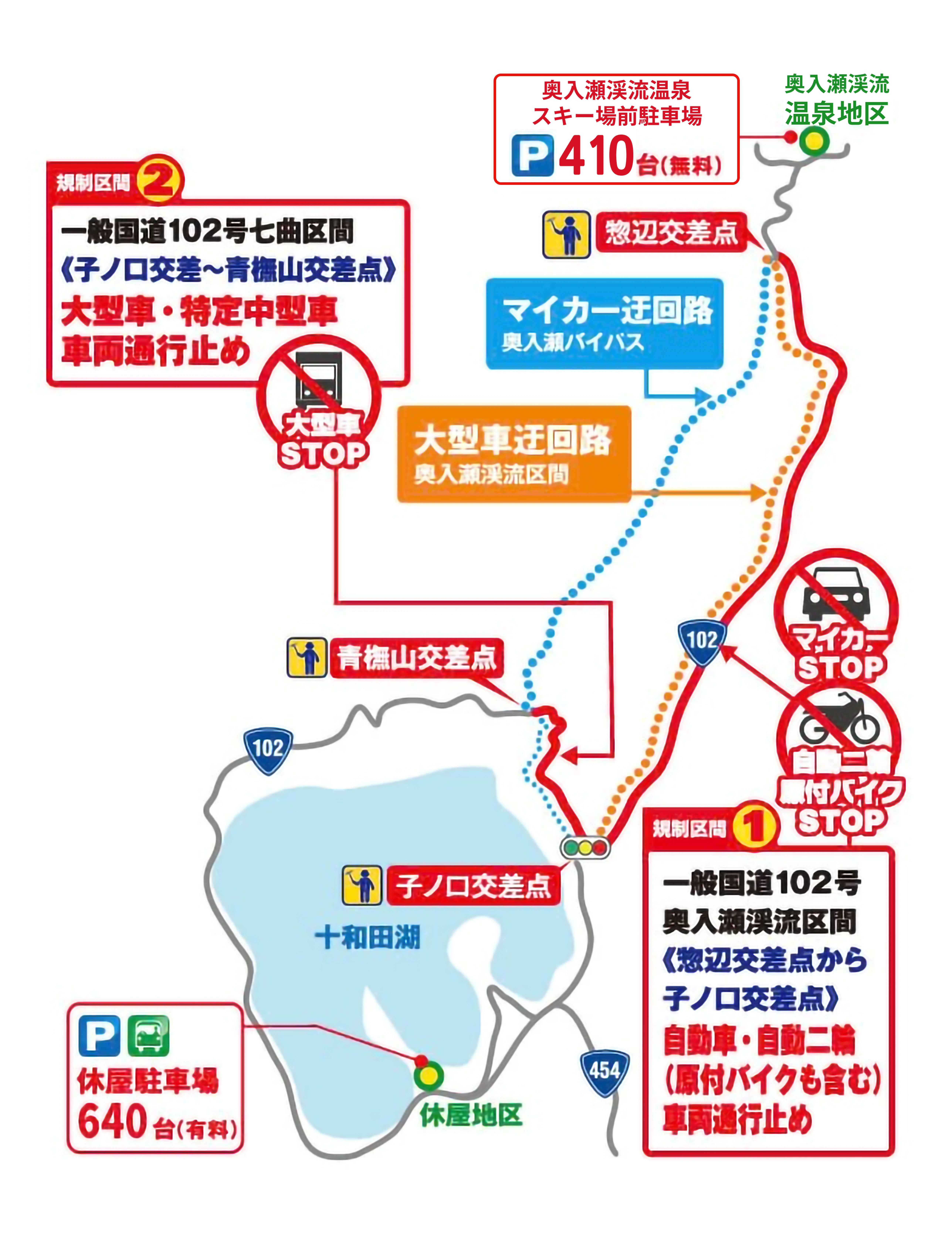 迂回路となっている七曲区間は、急カーブ、急勾配が連続するため、大型車のすれ違いが出来ません。このため、やむを得ず大型車両は奥入瀬渓流を通行してもよいこととしていますのでご理解をお願いします。