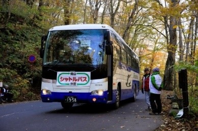 ※シャトルバスには写真のようにバス前面に「横断幕」を取り付けていますが、路線バスは「横断幕」が付いていません。