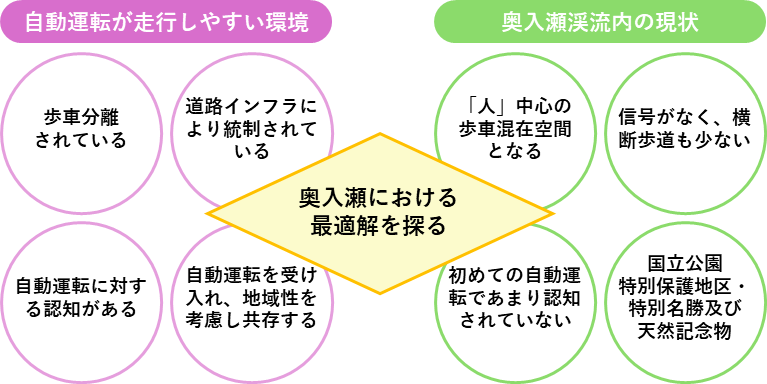 - バイパス開通後の奥入瀬に導入する交通に、どんなかたちであれば自動運転の実現ができるか、一緒に考えていきましょう。